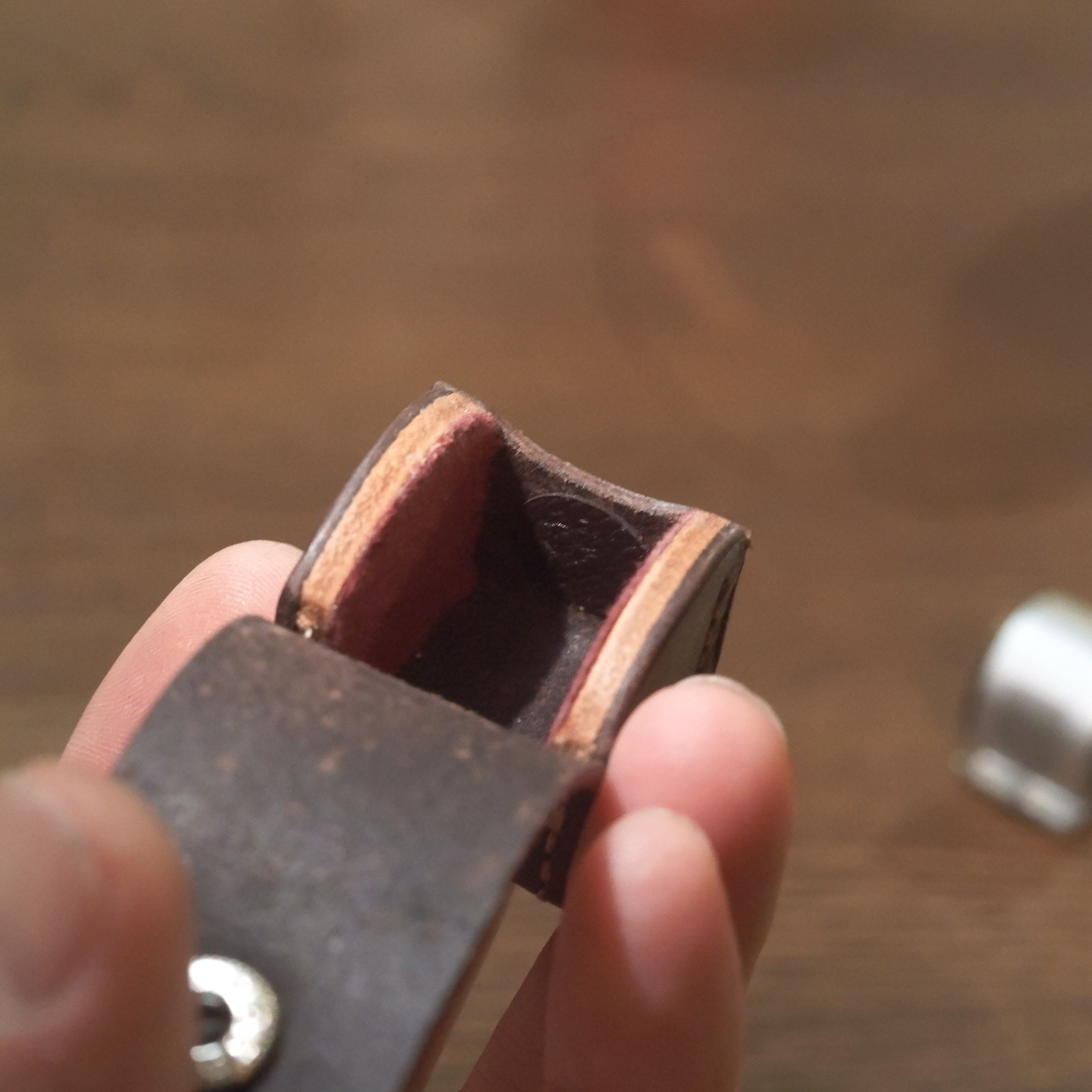 スナップボタンの内側に革パッチを当ててSBOOIに傷が付かないようにしております。
